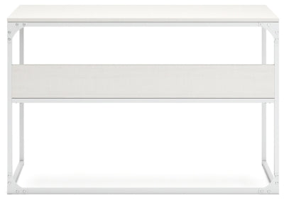 Bring your vision of a modern home workspace to life with this sleekly designed home office desk. Its linear construction and white finish keep things minimal. A small shelf along the back rounds out the versatile, striking desk.