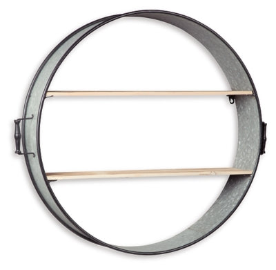 Create extra show-off space by hanging up this wall shelf. Its generously scaled barrel design with wooden shelves puts your decor on display with style. Galvanized metal adds an industrial feel to the look.