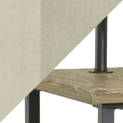- Made of metal and wood with fabric shade