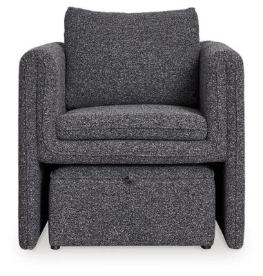 Create a stylish retreat with this space-saving accent chair and ottoman set. Its sophisticated charcoal and black upholstery adds modern elegance to small apartments, living rooms, dorms and more. Curl up and relax in the cozy embrace of the chair— and when you need to put your feet up, simply pull out the ottoman that tucks neatly underneath. The best part? This set arrives fully assembled.